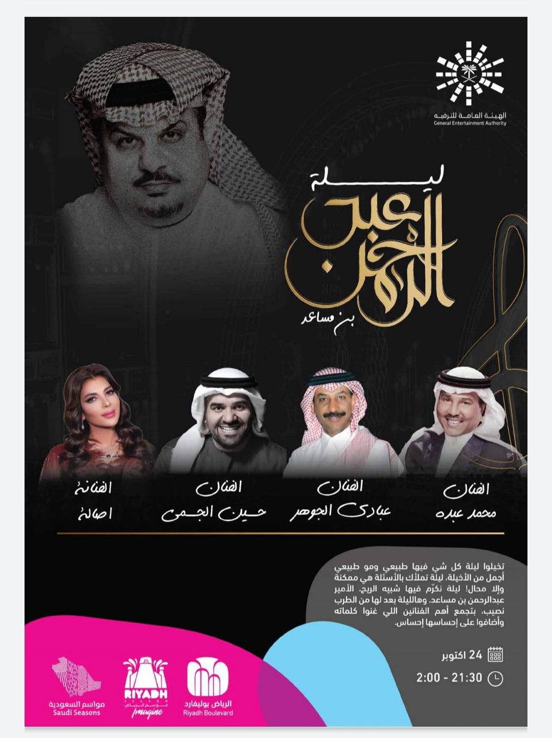 ألوان الرياض On Twitter ليلة عبدالرحمن بن مساعد ليلة تكريم الشاعر الامير عبدالرحمن بن مساعد Abdulrahman بحضور الفنانين محمد عبده وعبادي الجوهر وحسين الجسمي واصالة الرياض بوليفارد 24 اكتوبر 21 30 2 00 للجميع تذاكر Https T Co