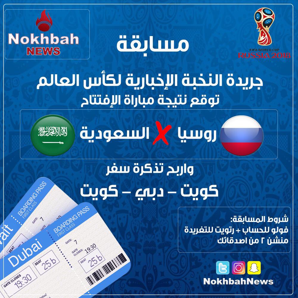 النخبة الاخبارية On Twitter توقع من الفائز في مباراة الافتتاح بين السعودية و روسيا وكم النتيجة شارك لفرصة ربح تذكرة كويت دبي كويت شروط المسابقة عمل فولو لحساب