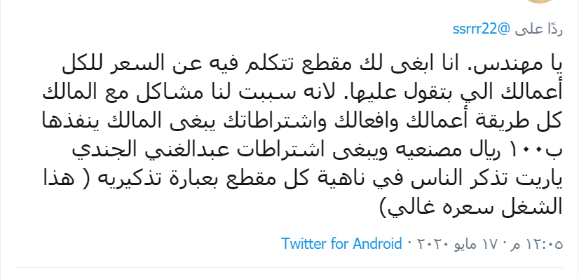 مهندس عبدالغني الجند على تويتر ياسيدي قبل ان توقع العقد ضع سعرك حسب مواصفات المشروع بحيث لا يكون فيه ظلم للمالك و لا خسارة لك لاحظت بعض المقاولين ياخذ باقل سعر